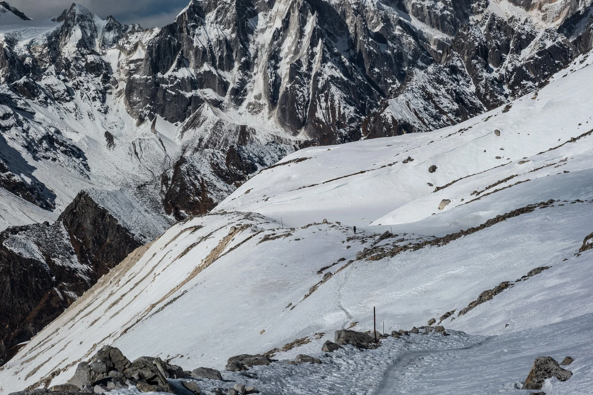 Those departing from Dharamsala typically leave for the pass at 4 a.m. The initial climb follows a very rocky trail along the Larkya Glacier, an eerie tongue of ice under the dim starlight that will be your voiceless companion for the next two hours or so. Micro spikes, which you can buy at very affordable prices in Kathmandu, will be needed if the route is icy and slippery.